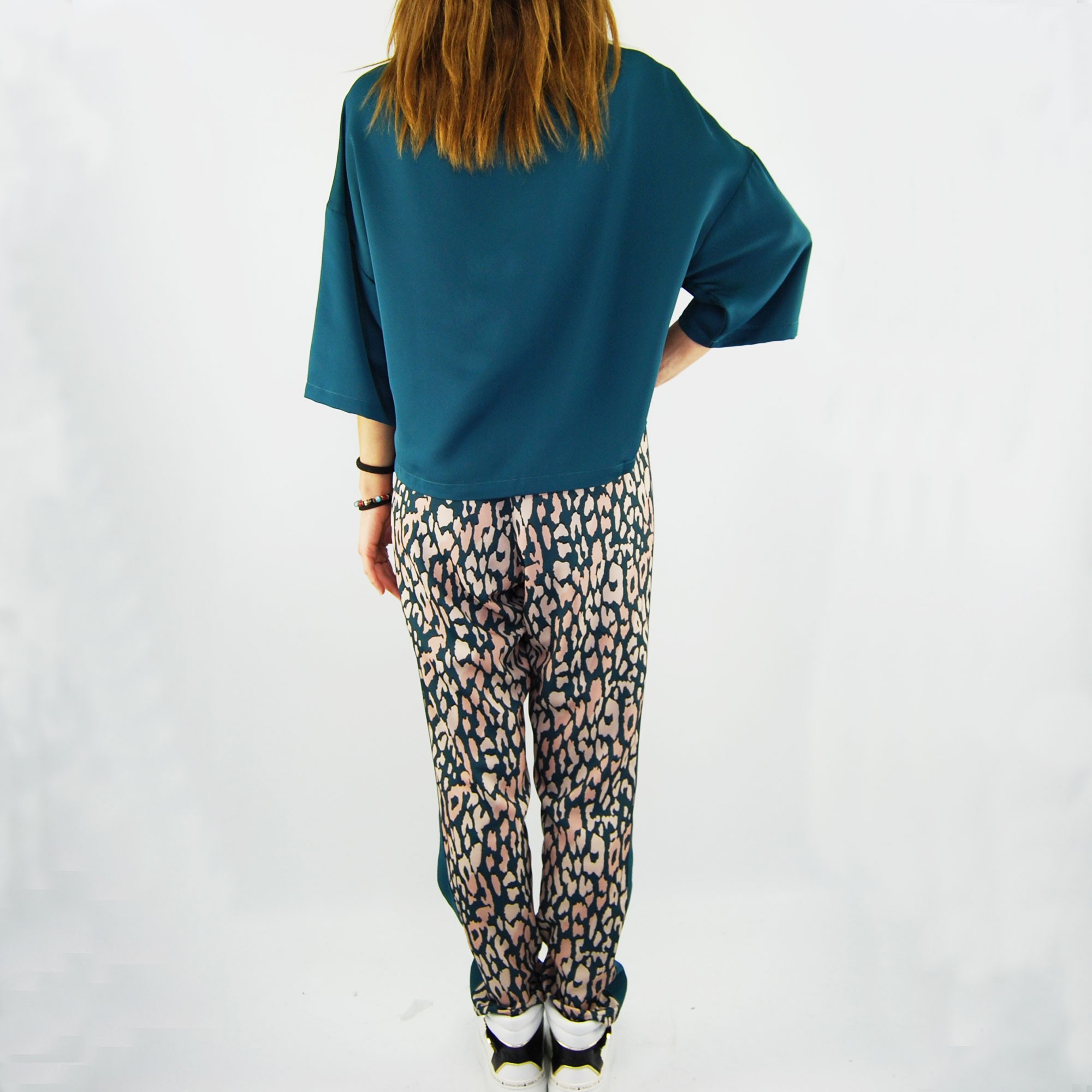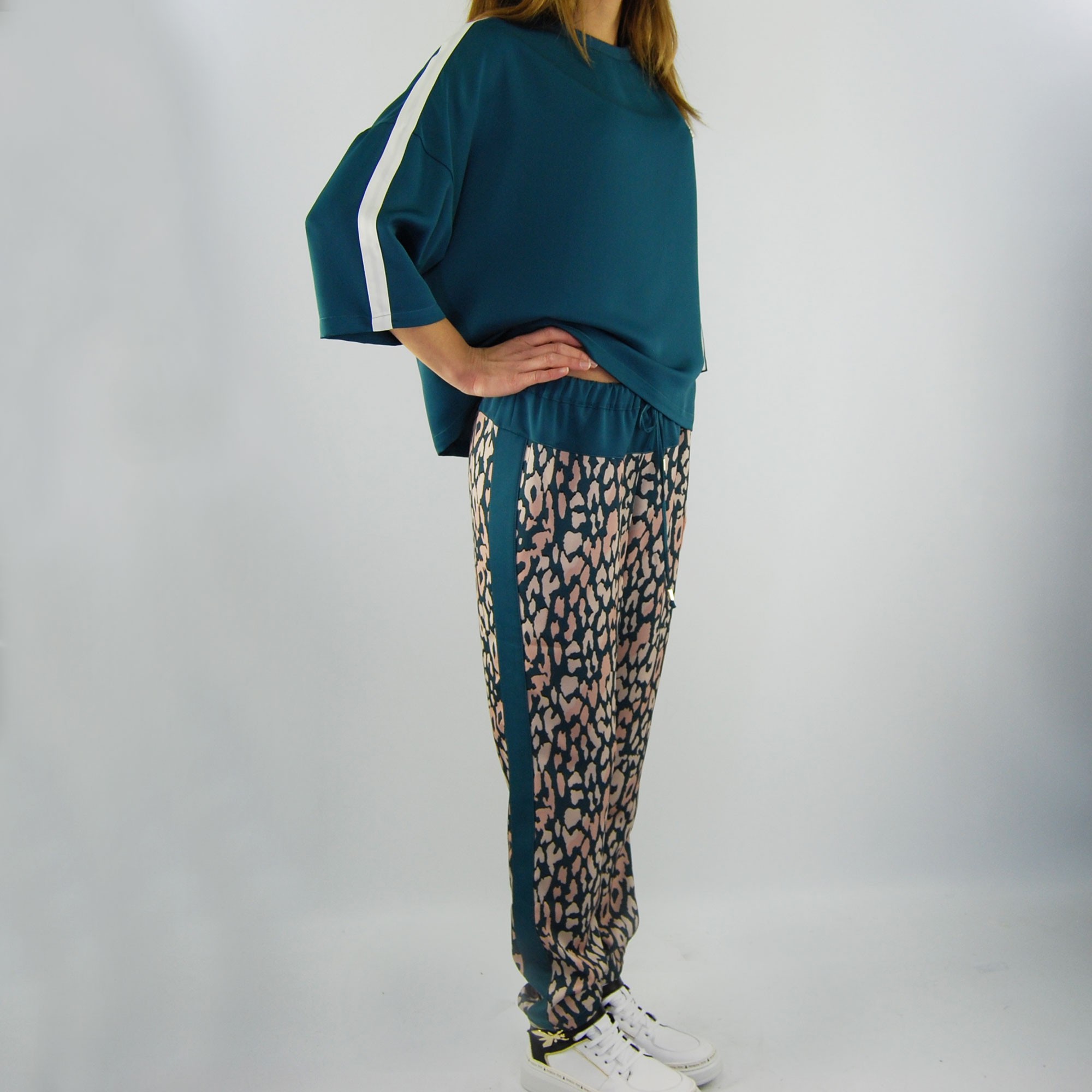 T-shirt haut, Liu Jo Sport en tissu technique, de couleur vert paon, col et manches 3/4. Il y a une bande verticale sur les deux manches de couleur angora. Logo Liu Jo d'or appliquée le devant du t-shirt.