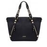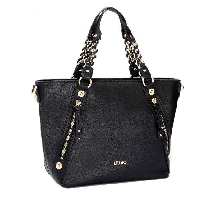 Sac Liu Jo lavande simili cuir en couleur noir équipé avec double poignée tressé, bandoulière réglable et fermeture zippée tout autour, et des décorations dorées.