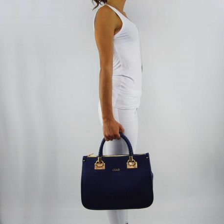 Sac Liu Jo m carré simili cuir royal, équipée d'un lit double tressé poignée et la bandoulière amovible et réglable. Sac divisé en trois compartiments, l'un des principaux fermé par un bouton magnétique et deux sur les côtés avec fermeture à glissière. Logo détail, fermeture à zip et applications or. Doublure intérieure de couleur jaune, et le sac de protection de la poussière, y compris l'original.