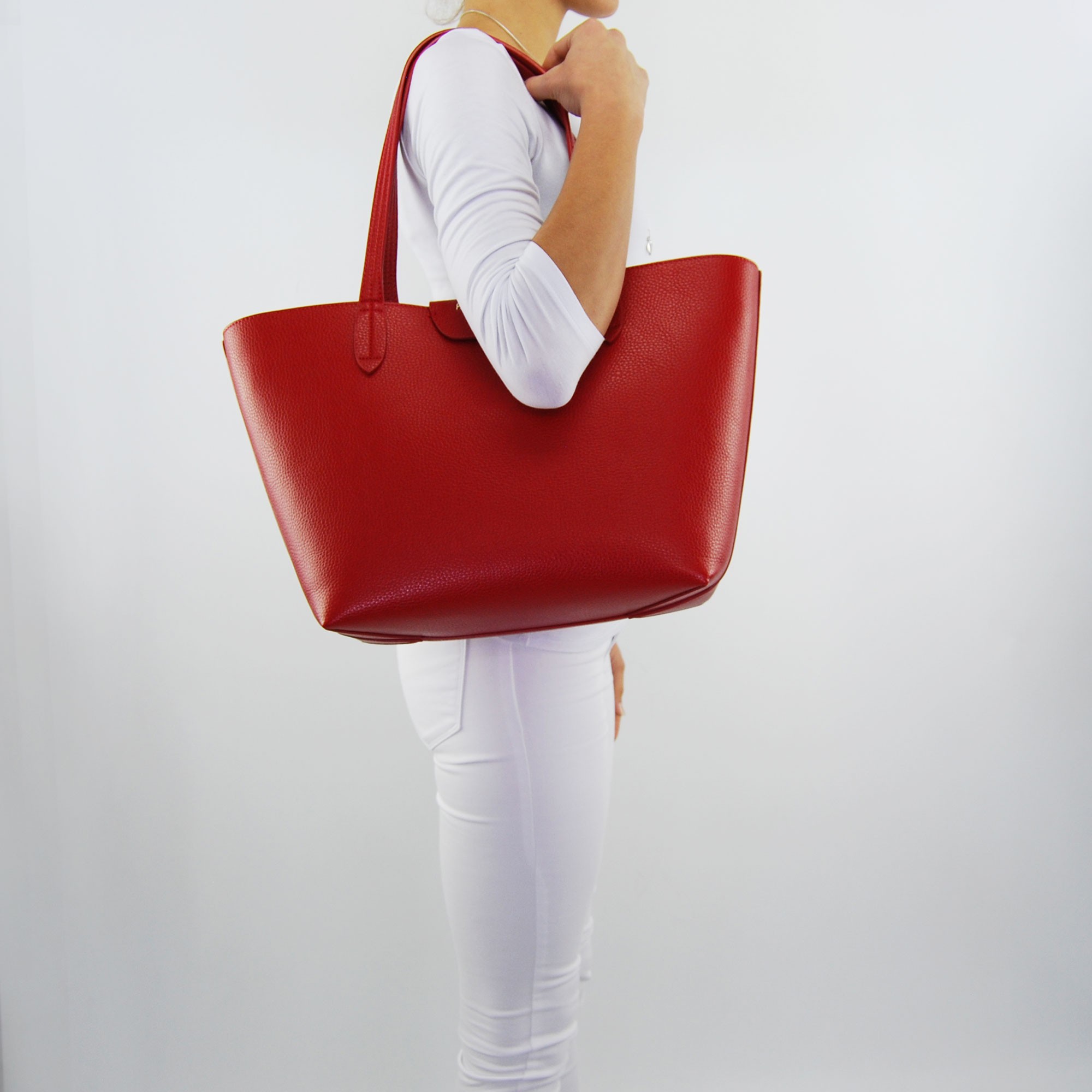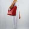 Sac Shopping par Patrizia Pepe rouge réversible. Peut être porté par le côté rouge ou du côté du gris foncé poignées de rouge. Fermeture laçage à serrer, Patrizia Pepe logo de couleur d'or appliquée sur le devant. À l'intérieur il y a un maxi sac d'embrayage avec manche amovible et fermé avec un zip. Sac de protéger de la poussière, y compris l'original.