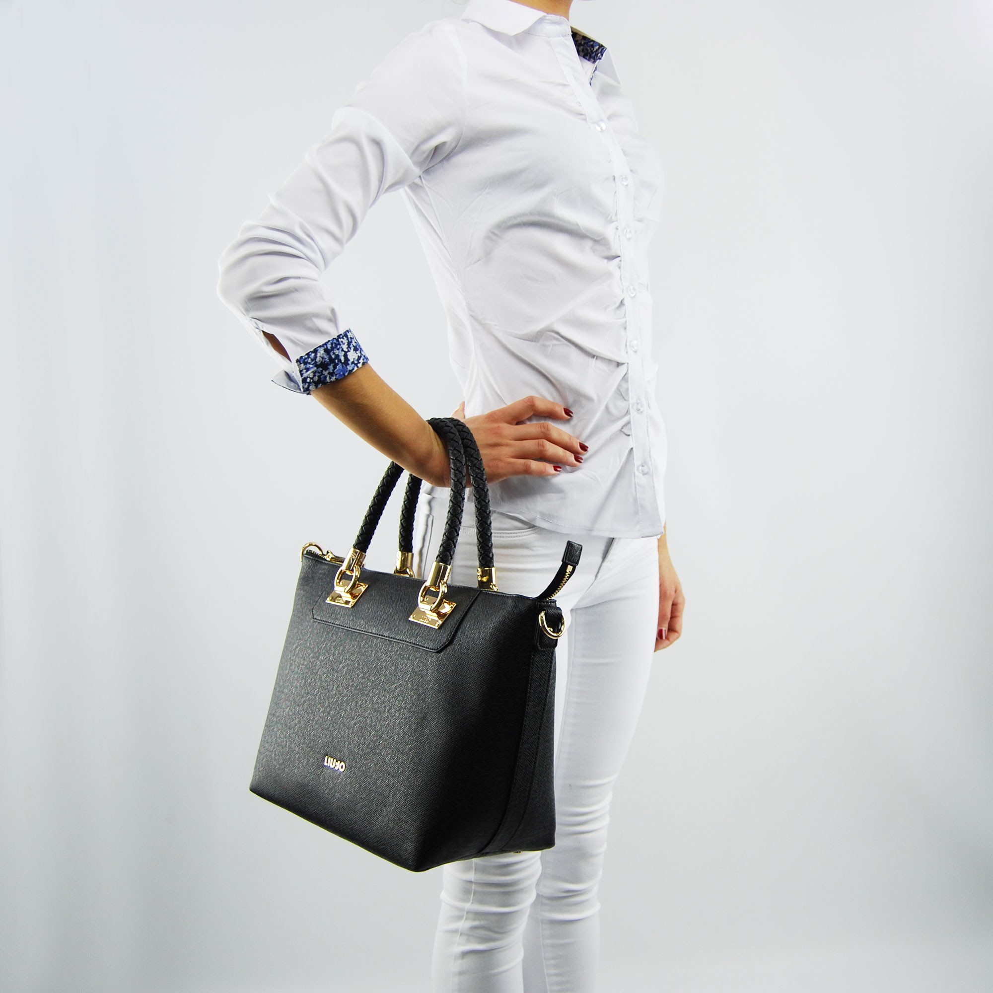 Sac Shopping horizontale Liu Jo anna noir, avec double poignée. fermeture fermeture éclair dorée, les applications, et le logo Liu Jo de couleur d'or. Les petites poches de rangement internes, doublure intérieure de couleur ocre. Sac de protéger de la poussière, y compris l'original.