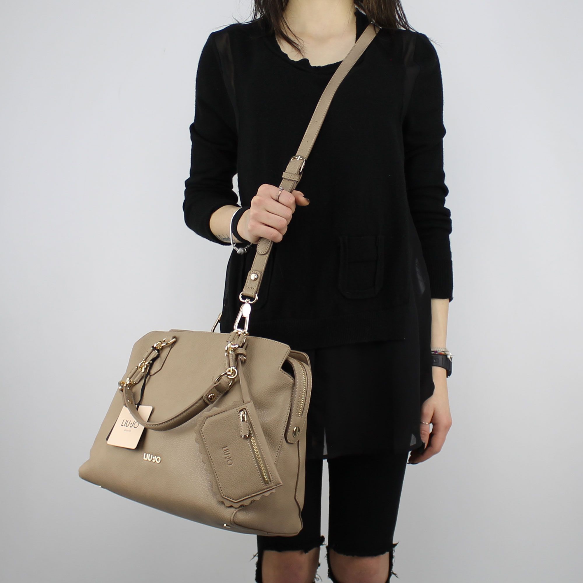 Sac Liu Jo L sacoche de detroit en similicuir de couleur de grès, avec double poignée et d'une bandoulière amovible et réglable. Le sac est divisé en trois compartiments, le central fermé par zip et deux côté fermé avec bouton magnétique. La fermeture zip de couleur d'or, qui s'étend sur l'ouverture de la poche, et vous pouvez l'arrêter à côté du sac à dos avec bouton clip. Logo Liu Jo d'or de la couleur appliquée sur la face avant. Or inserts. Doublure intérieure rayée rose et noir. Sac de protéger de la poussière, y compris l'original.