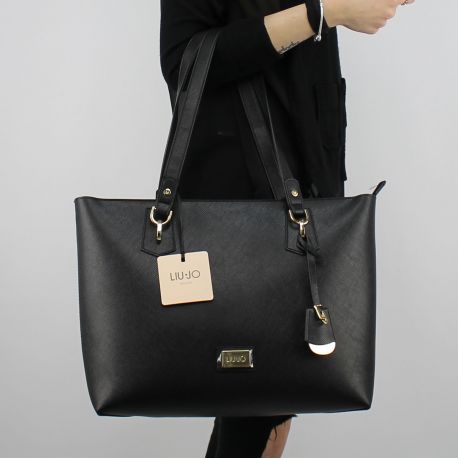Sac Liu Jo en cuir artificiel noir avec un effet saffiano à double poignée et bandoulière réglable et amovible. Seul compartiment à fermeture à glissière dorée. À l'intérieur de poches pour le stockage et la pratique de la beauté de cas fournies pour une utilisation aussi comme un sac d'embrayage. Doublure doublure intérieure en cuir synthétique avec imprimé cœurs. Plaque de métal avec logo de la marque appliqué sur le front. Sur le cou il y a un pendentif en imitation cuir et métal doré qui peut être enlevée. Sac de protéger de la poussière, y compris l'original.