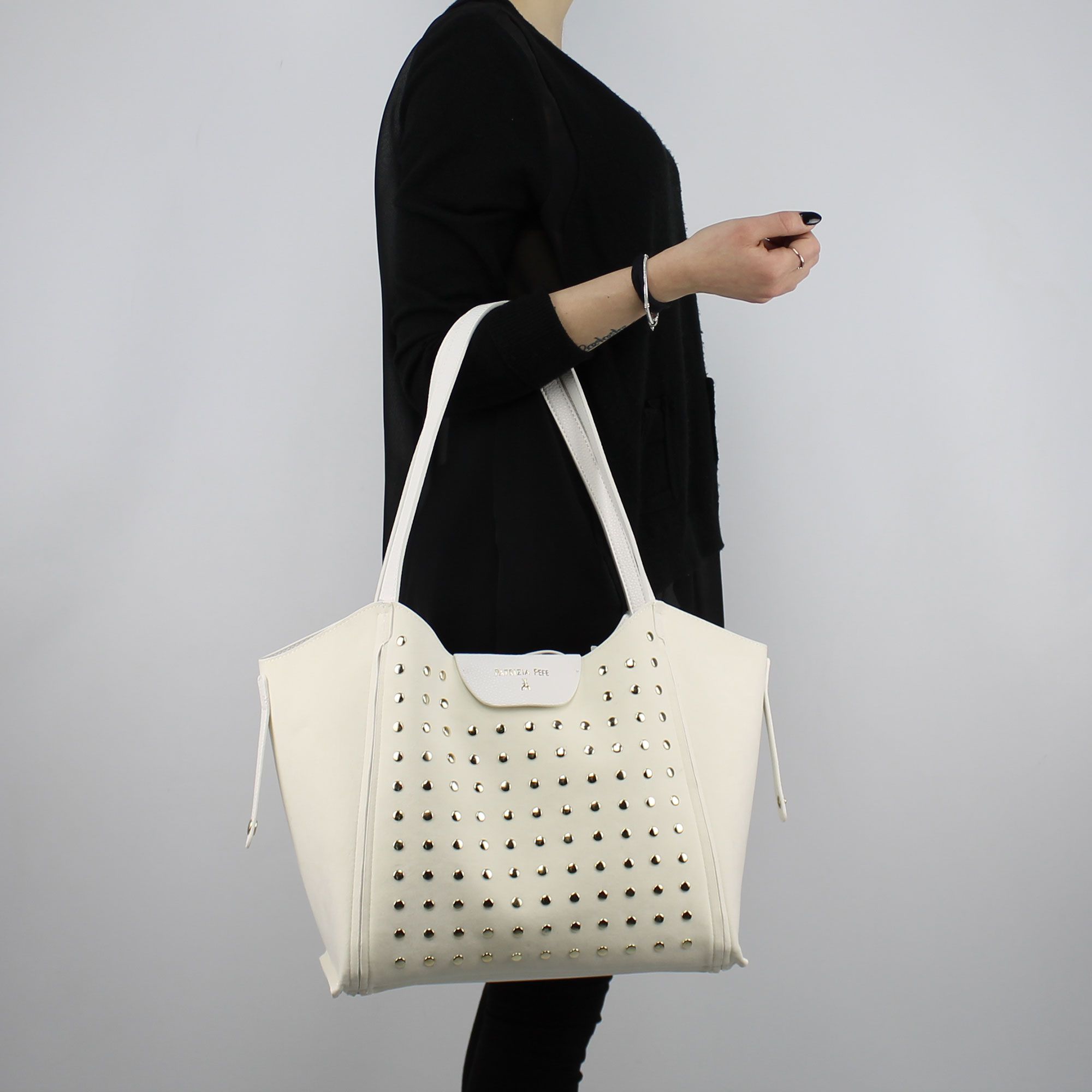 Sac Shopping réversible Patrizia Pepe en faux cuir blanc avec clous, strass goujons et en forme d'étoile rouge, jaune et blanc de différentes tailles. Ce modèle est l'évolution de la classique Classique Double réversible Patrizia Pepe, qui a été remanié dans la partie supérieure où il présente une coupe moins régulière, avec l'arrondi des pièces qui se complètent et font de la plupart de la tendance, et nous avons Également été allongé légèrement sur la poignée, de sorte que vous pouvez être plus à l'aise d'utiliser le sac de la sangle d'épaule. Ce panier peut être porté à la fois sur le côté en simili cuir blanc avec des clous, des strass et clous en forme d'étoile, qui, du côté de la crème avec un effet velours avec des clous et lisse d'or. Des deux côtés, il est possible d'avoir le sac en forme de shopping classique, à l'intérieur du sac avec fermeture à glissière, ou vous pouvez averlla en forme de seau à travers l'union de deux sangles avec un bouton pression (voir photo); Dans la version du sac seau vous l'utilisez sans le sac intérieur. Le corps du sac dispose de deux lacets de fermeture qui peut être utilisé pour le fermer dans toutes les configurations d'utilisation. Le logo de la marque est appliquée à la fois à la couleur-les variantes d'utilisation. Le sac intérieur est fermé par un zip et possède en interne les petites poches dont une avec zip. Le sac est fourni avec un sac de protéger de la poussière de l'original avec l'impression du logo Patrizia Pepe.