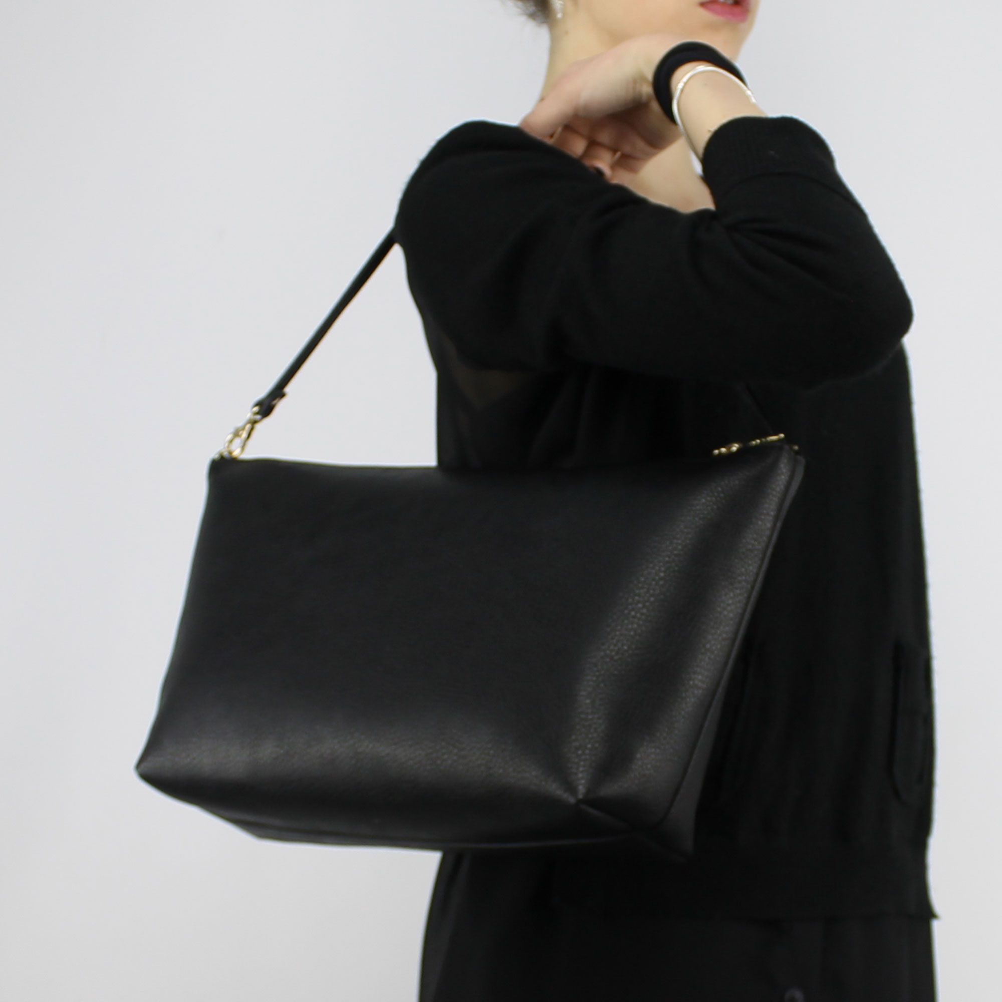 Sac Shopping par Patrizia Pepe en faux cuir noir réversible or. Ce panier peut être porté à la fois sur le côté et total black de côté or poignées noire. A l'intérieur il ya une poche avec fermeture à zip et loquet de sécurité le crochet permet de le crochet pour le corps du sac, et de garantie de l'union. Le sac intérieur, en plus d'avoir cette utilisation, il peut également être utilisé comme un un deuxième sac, et de le porter sur votre épaule grâce au cordon de sécurité qui accro pour la boucle approprié devient une pratique bandoulière. Le sac intérieur est petit poches dont une avec zip. Le principal carrosserie a deux laçage à égalité pour les externes fermeture. Le logo de la marque est appliquée à l'avant dans les deux variantes, l'utilisation de la couleur. Le sac est fourni avec un sac de protéger de la poussière de l'original avec l'impression du logo Patrizia Pepe.