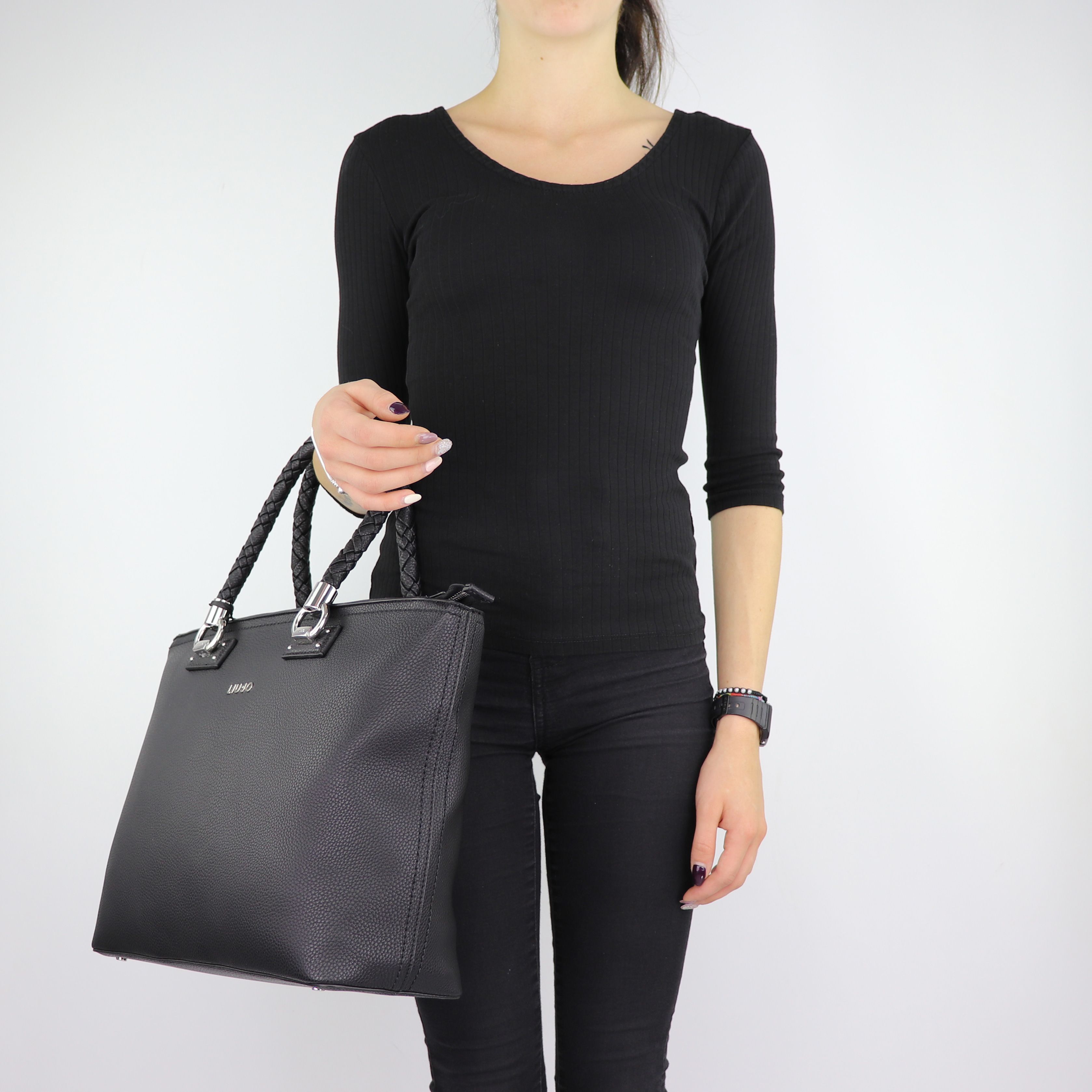 Sac Liu Jo en simili-cuir, a chuté de noir, avec double tressé poignée rejoint le sac avec crochets en métal argenté, avec une gravure du logo. Le sac a une bandoulière réglable et amovible. Compartiment unique, fermée par fermeture à zip argenté, intérieur: deux poches pour le stockage, y compris un zip verrouillable. Doublure en doublure en sable de couleurs de tissu. Lettrage de la marque imprimé sur le devant. Sac de protéger de la poussière, y compris l'original.