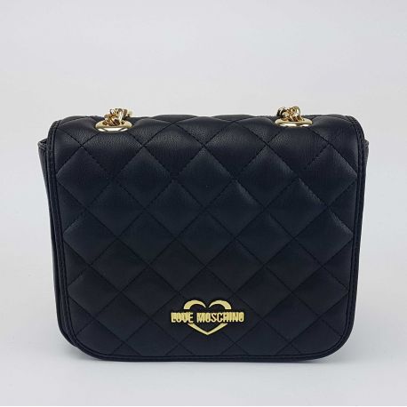 Sac à bandoulière marque Love Moschino en faux cuir matelassé noir, fermeture avec rabat et bouton magnétique. Les poignées avec une chaîne en or et d'une poignée en simili cuir. Le Logo de la marque appliquée sur le rabat. À l'intérieur de petits compartiments de rangement. Doublure intérieure de couleur rouge. Sac de protéger de la poussière, y compris l'original.