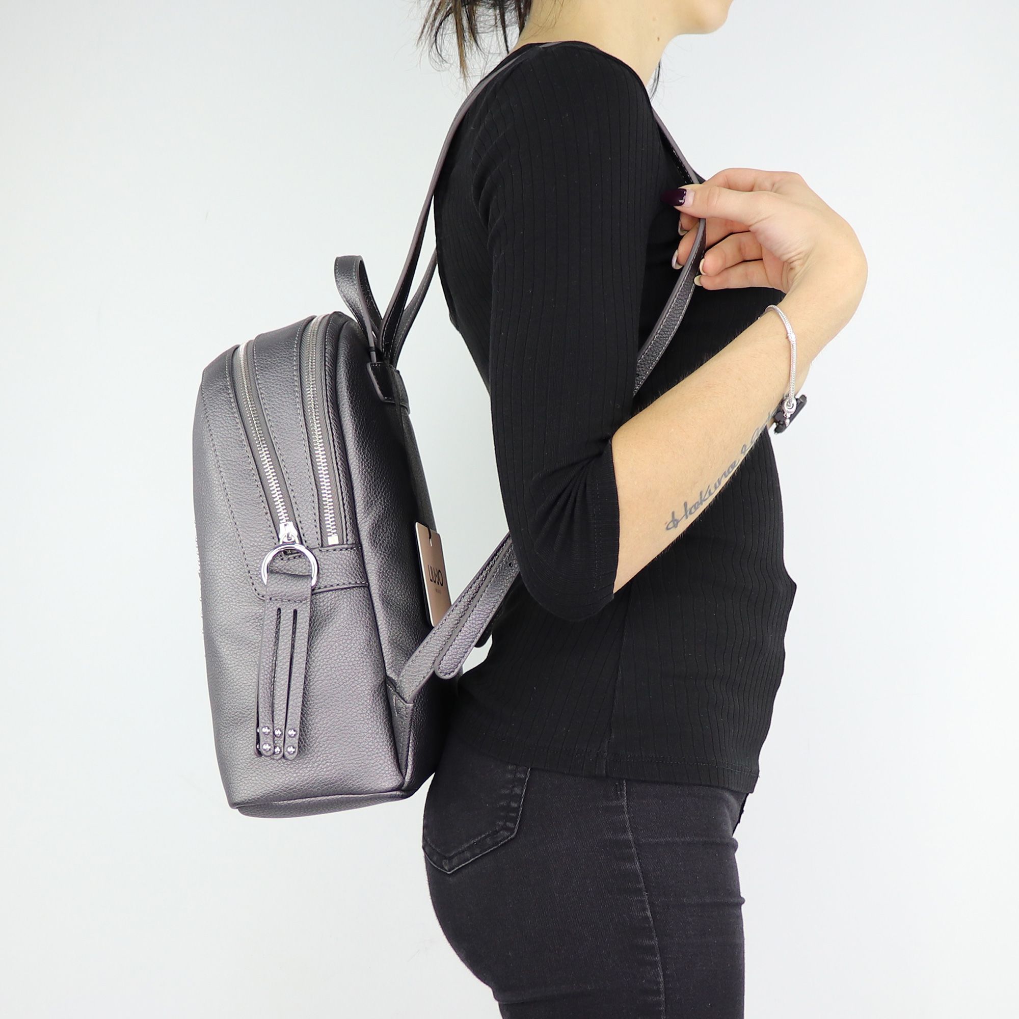 Sac à dos sac Liu Jo en cuir gris effet laine. Le sac à dos est équipé d' bretelles réglables et poignée de transport pour une prise en main confortable. Le sac à dos a avec deux compartiments, verrouillable avec une fermeture à zip, sur lequel il y a des crochets en argent yeux avec des applications de franges de cuir et de micro-goujons en métal d'argent. Intérieur du sac il y a deux poches pour le stockage qui un refermables avec fermeture-éclair; l'intérieur de la doublure de la doublure est en tissu avec effet pied de poule noir et de poudre de rose. L'avant du sac à dos dispose d'un emplacement central dans la incision le logo de la marque et le modèle écrit Liu Jo, dans une forme circulaire, avec des micro-crampons en métal argenté. Sac de protéger de la poussière, y compris l'original.