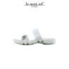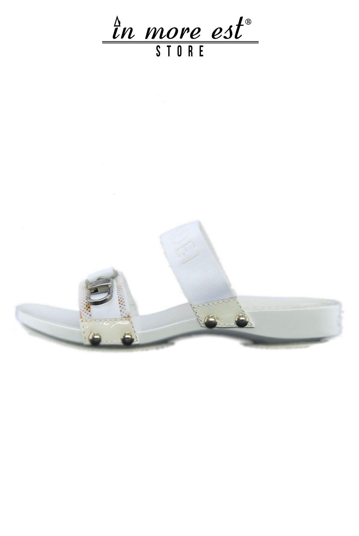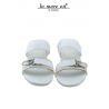 Sandale blanche avec des bandes de tissu blanc, fond en bois, argent logo Casadei