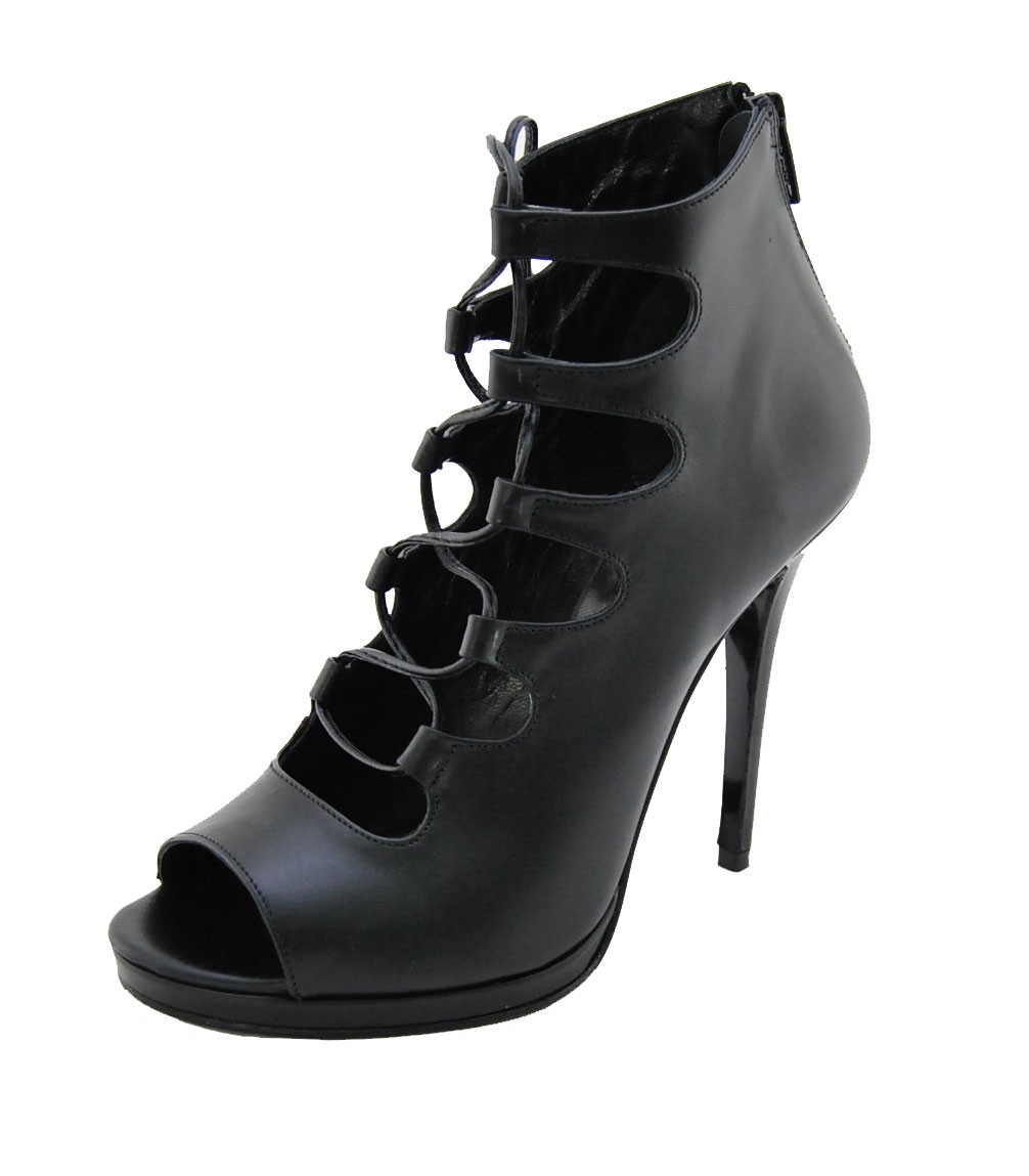 Noir sandale avec talon Lea Jo lacé en cuir.La peau recouvre le pied jusqu'à cheville laissant lui et a découvert la sauté et de l'arrière du pied où il mêle une chaîne de cuir noir qui atteint au-dessus de la cheville et peut être fixé la proue à l'avant est un lien à la cheville. Laçage avec zip noir derrière le talon est très confortable et rapide.