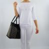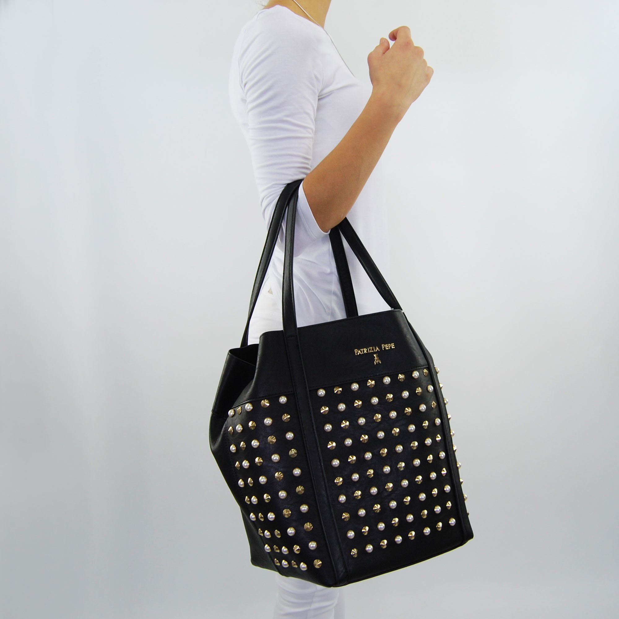 Sac seau Patrizia Poivre noir en cuir synthétique, avec l'application des goujons d'or et de perles. Logo Patrizia Le poivre dans la partie avant. Auto-cravate de fermeture et bouton pression. À l'intérieur de il y a un maxi sac d'embrayage, qui est amovible, qui se ferme avec un zip et une petite poche le panier de stockage. Sac de protéger de la poussière, y compris l'original.