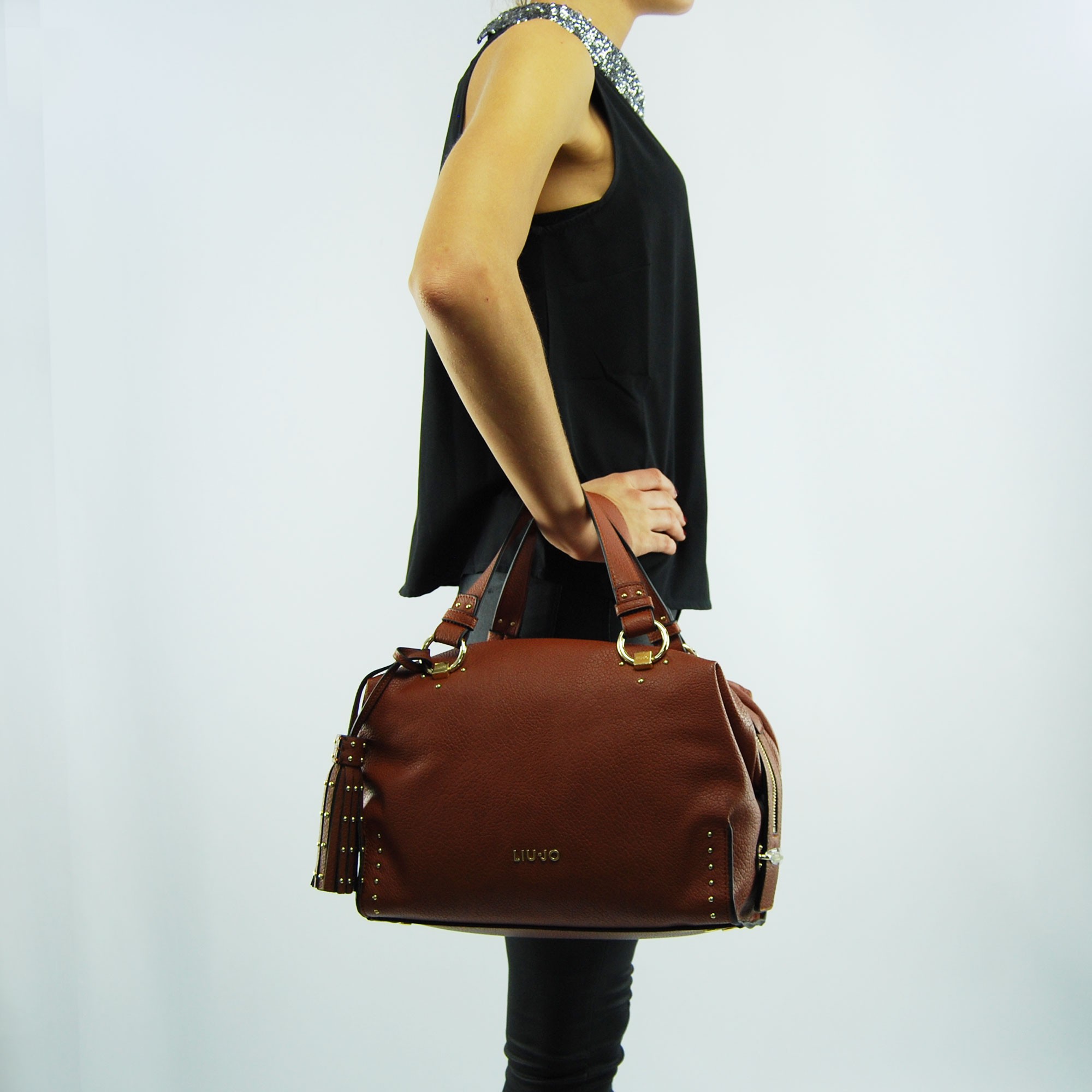 Borsa bauletto Liu Jo en simili cuir de couleur marron whisky avec double poignée et la bandoulière amovible et réglable. Zip, l'application d'un pendentif frangées, décoré avec des petits clous en or de couleur, la même chose pour les bords du sac. Logo Liu Jo d'or. L'intérieur de la poche pour ranger de petits objets. doublure intérieure de couleur rose, sac de protéger de la poussière, y compris l'original.
