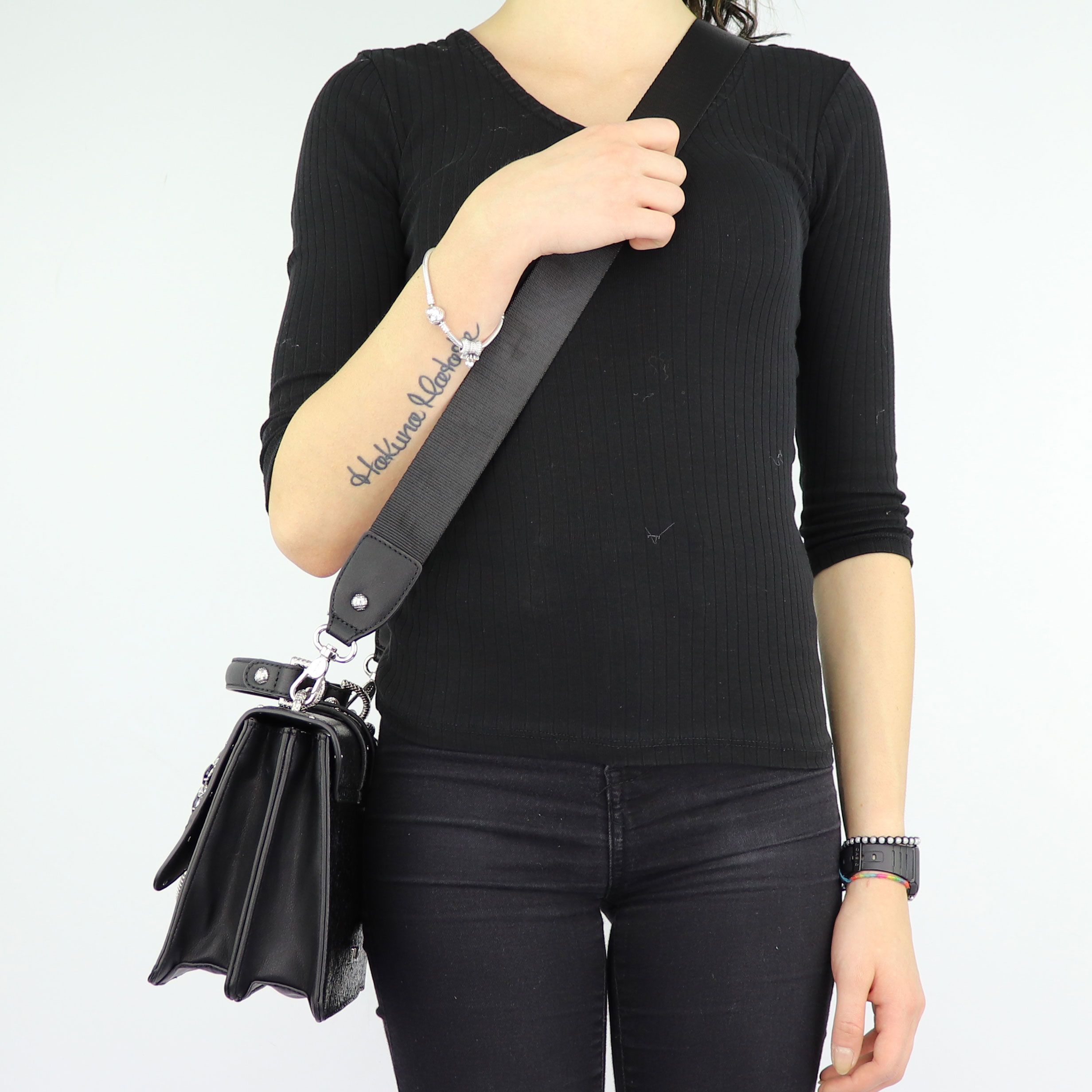 Sac à main et bandoulière Liu Jo python noir. Le sac a une seule poignée rejoint le sac à travers des anneaux en métal, plaqué argent, que vous pouvez rejoindre aussi la sangle d'épaule. Le rabat avant les fonctionnalités de l'application des crampons et des micro-crampons métal d'argent et de faux cristaux de tailles différentes qui lui donnent de l'éclat unique dans le sac, mais ce qui le rend encore plus élégant et sophistiqué est l' la représentation d'un serpent au-dessus de la rainure de la fermeture. Le sac est divisé dans les trois compartiments dont central zip verrouillable avec deux poches port des objets. La doublure à l'intérieur de la housse est en tissu de couleur antique rose. Le Lettrage du logo de la marque gravé au bas du dos en métal argenté. Sac protéger poussière d'origine inclus.