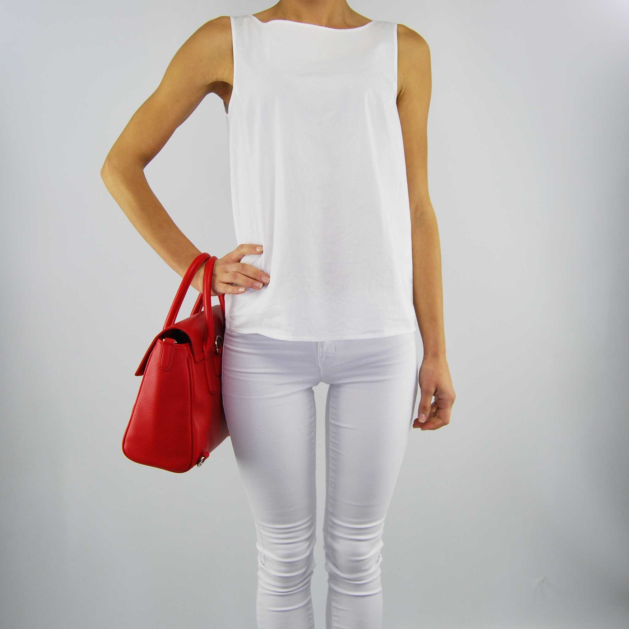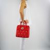 Borsa bauletto Versace Jeans in ecopelle rossa, dotata di doppio manico e tracolla removibile e regolabile, utilizzabile anche come zainetto. Chiusura con patta e bottone automatico. Applicazione di rivetti nella parte frontale. All'interno piccola tasca portaoggetti. Fodera interna nera, sacca proteggi polvere originale inclusa.