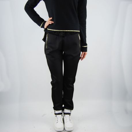 Pantalone Liu Jo Sport in tessuto tecnico nero con bande laterali in maglina. Elastico in vita, due taschine chiuse con zip dorata. Vestibilità morbida, modello regular.