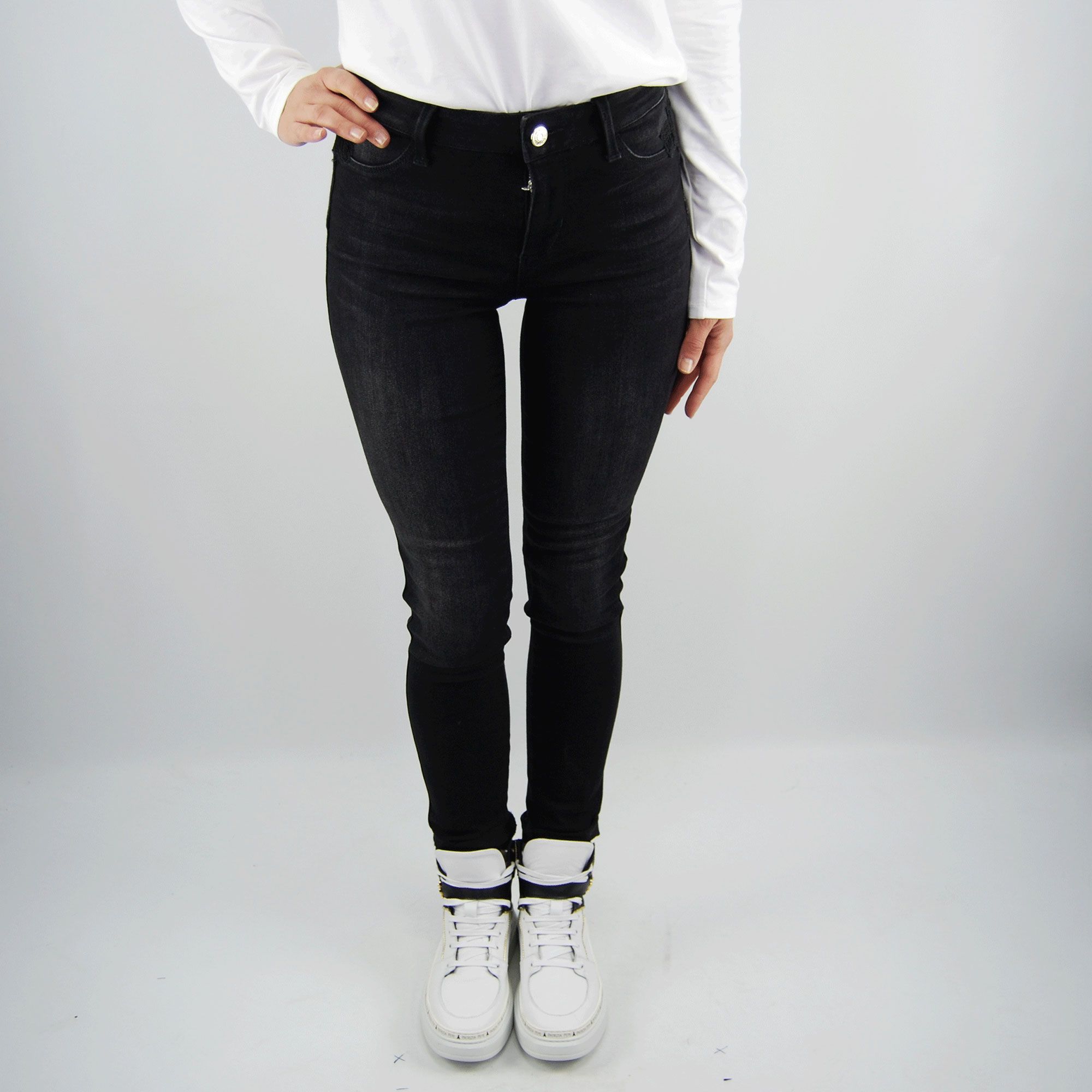 Pantalone jeans skinny Liu Jo colore nero lavaggio sbiadito, con motivo macramè è paillettes nere applicate a livello della vita nel lato posteriore del jeans. Tessuto stretch, vita medio-alta.