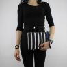 La borsa esternamente è realizzata da un lato in tessuto stampato a righe nei colori blu, beige e nero, invece dall'altro lato è realizzata in similpelle stampata effetto trama nei toni del blu. Nel lato similpelle riporta la stampa del logo Liu Jo nel colore beige a contrasto su fondo blu. Il laccio che fa da polsiera è in similpelle come uno dei lati della pochette, ed è asportabile permettendoci così di poter utilizzare la pochette sia da polso che a mano senza il laccio. Fodera di rivestimento interno in tessuto di colore blu. Sacca proteggi polvere originale inclusa.