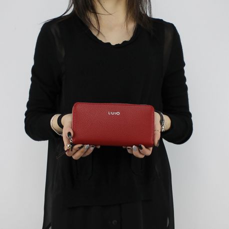 Portafoglio Liu Jo xl arizona in similpelle color rosso ciliegia, chiusura con zip around. All'interno scomparti portabanconote, taschine portatessere ed una tasca centrale chiusa da zip per le monete. Fodera interna a righe rosa e nere. Logo Liu Jo color oro applicato frontalmente.