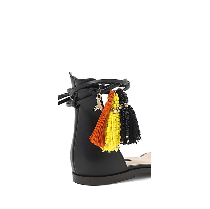 Sandalo Patrizia Pepe Hippy Suede, fascia in pelle intrecciata con pelle laminata, fascia a treccina con glitter, allacciato alla caviglia, ciondolo Fly sulla scarpa destra, decorazione di nappe colorate con perline, soletto e fodera in Pelle, suola in Cuoio verde personalizzata, altezza gamba 12cm dal tacco