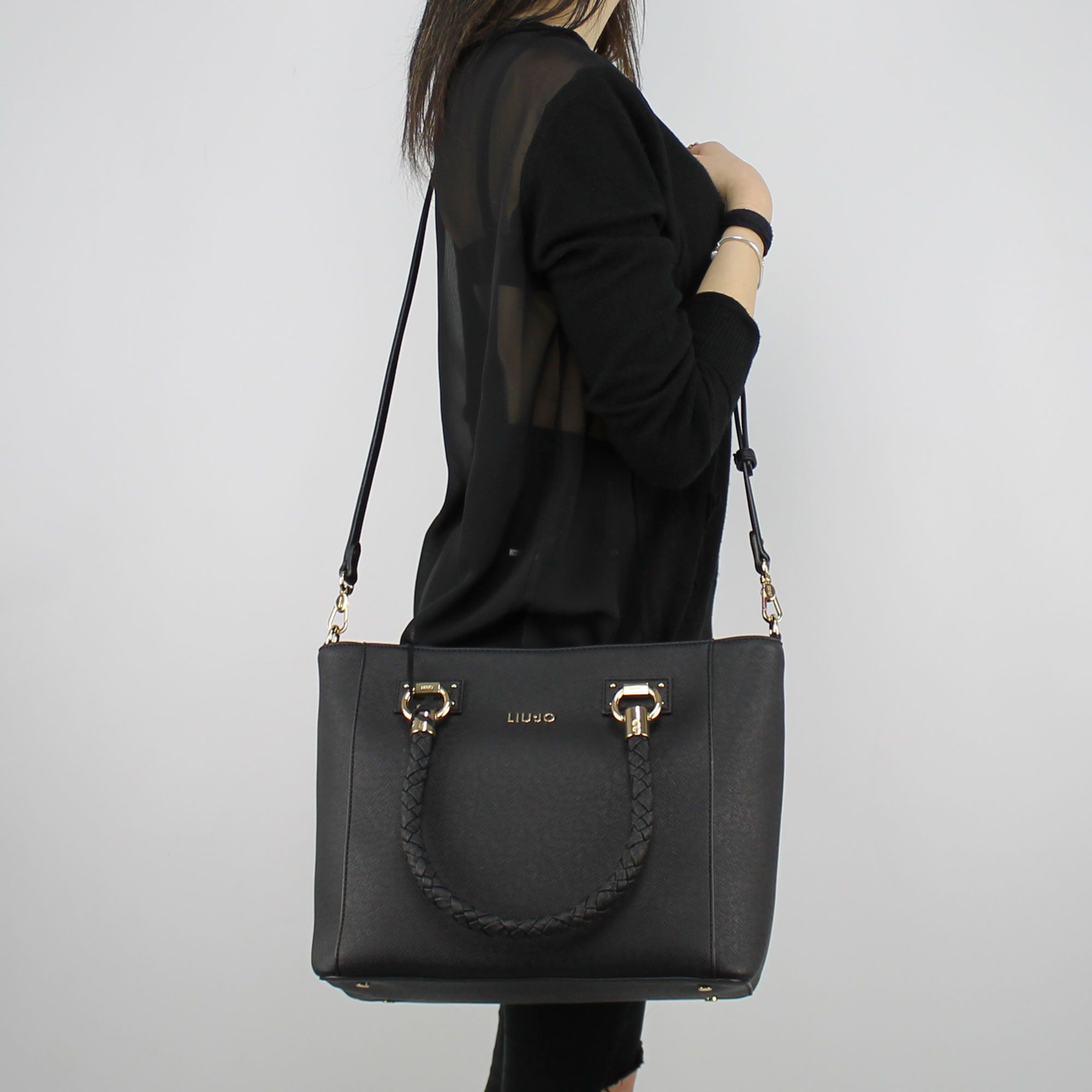 Borsa shopping Liu Jo m tote manhattan in tessuto saffiano nero dotata di doppio manico e tracolla removibile e regolabile. Unico scomparto chiuso da zip color oro ed una taschina porta oggetti nel lato posteriore della borsa. All'interno taschine portaoggetti e fodera a righe color nere e rosa antico. Logo del Brand applicato frontalmente. Sacca proteggi polvere originale inclusa.