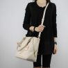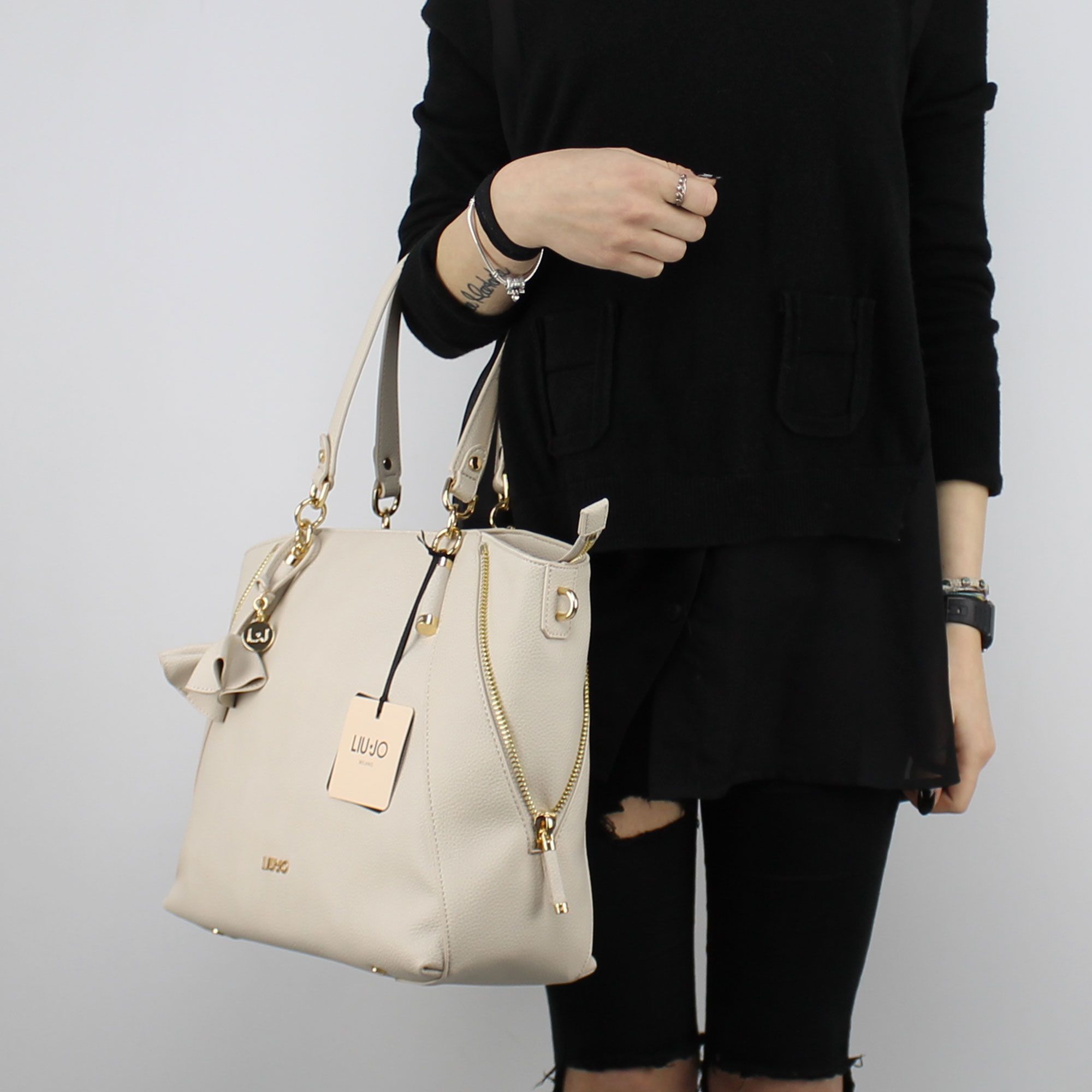 Borsa Shopping Liu Jo in similpelle bottalata soia, dotata di doppio manico e tracolla regolabile e removibile. Unico scomparto chiuso da zip dorata, all'interno taschine portaoggetti. Fodera di rivestimento interno a righe blu e panna. Logo del brand dorato applicato frontalmente. La shopping presenta: nel lato frontale un ciondolo con due pendenti in similpelle e targhetta rotonda del logo con brillantini incastonati, e nei lati due zip dorate che la impreziosiscono. Sacca proteggi polvere originale inclusa.