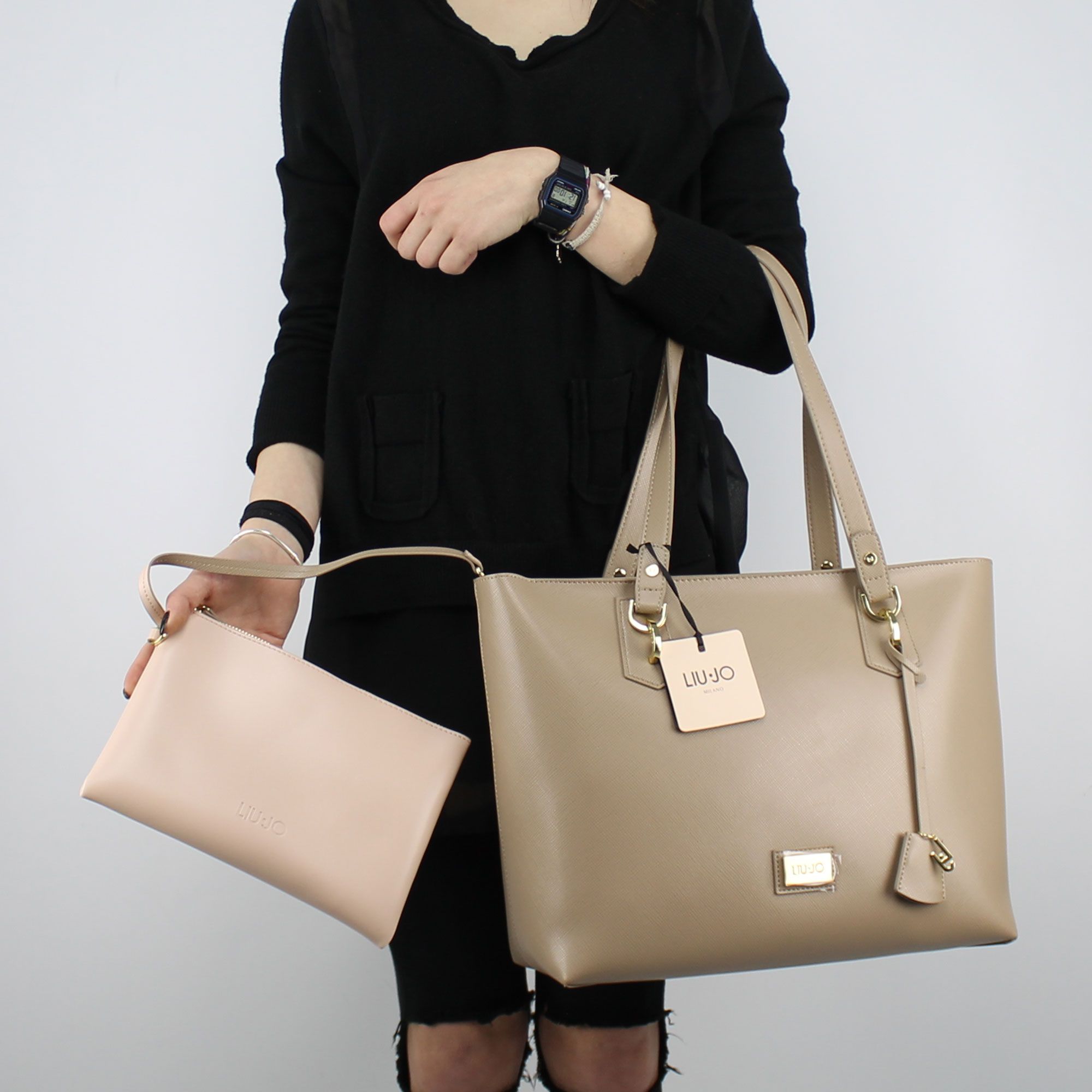 Borsa shopping Liu Jo M tote hawaii in similpelle color arenaria con interno rosa, dotata di doppio manico. Chiusura con zip color oro. All'interno è presente una taschina portaoggetti ed una pochette che all'occorrenza può essere usata singolarmente. Targhetta con logo del brand applicata frontalmente, inserti color oro. Sacca proteggi polvere originale inclusa.