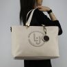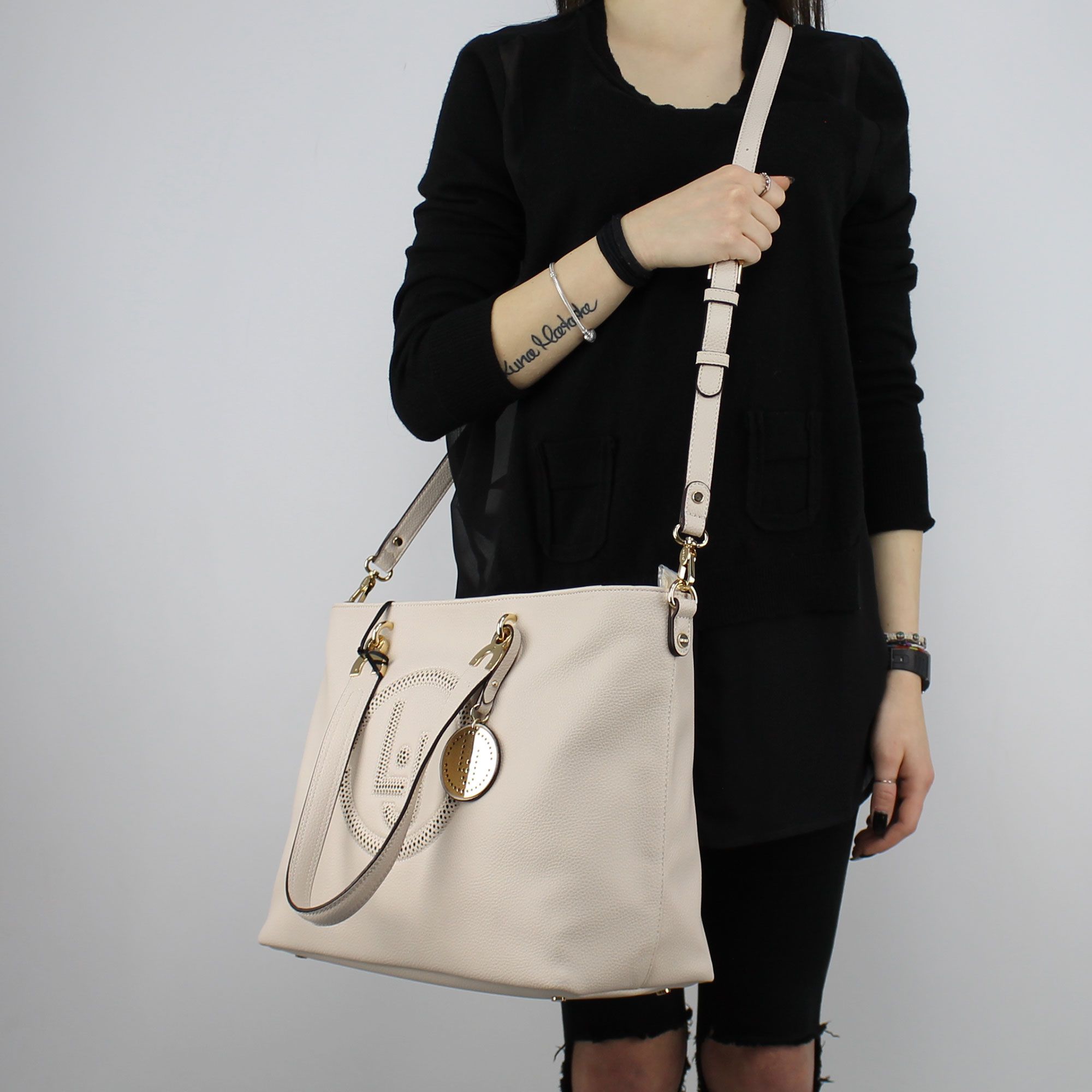 Borsa Shopping Liu Jo in similpelle bottalata soia, dotata di doppio manico e tracolla regolabile e removibile. Unico scomparto chiuso da zip dorata, all'interno taschine portaoggetti. Fodera di rivestimento interno in tessuto con fantasia multicolore. Logo del brand stampato frontalmente. La shopping presenta un ciondolo rimovibile in similpelle e targhetta rotonda del logo con forellini che riprendono il motivo stampato nel lato frontale. Sacca proteggi polvere originale inclusa.