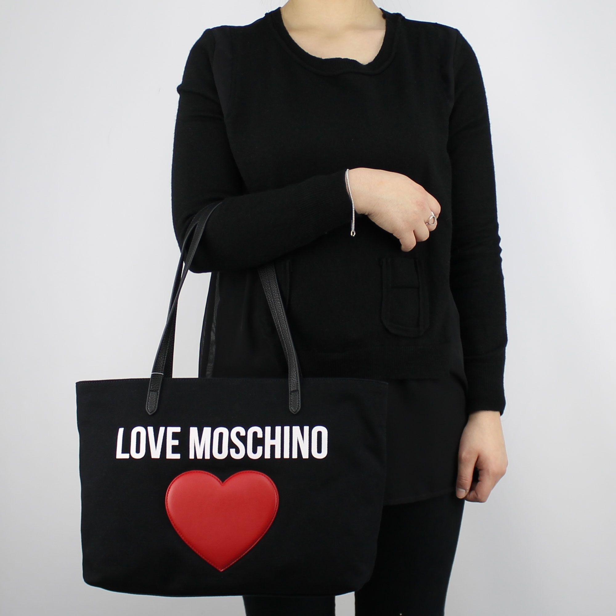 Borsa shopping Love Moschino nera in tela e applicazioni in similpelle. Nella parte frontale è applicato un cuore rosso, che contraddistingue univocamente il brand, e sopra di esso il logo "LOVE MOSCHINO". La shopping è dotata di una zip e al suo interno presenta una piccola tasca porta oggetti. Fodera interna in tessuto ramato. Sacca proteggi polvere originale inclusa.