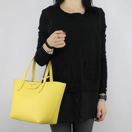 Borsa shopping Patrizia Pepe in similpelle giallo limone reversibile perla. Questa shopping può essere indossata sia dal lato total giallo che dal lato perlato con manici gialli. All'interno è presente una sacca con zip e laccio di sicurezza con moschettone che permette l'aggancio alla scocca della borsa garantendone l'unione. La sacca interna, oltre ad avere questo utilizzo, può essere anche utilizzata come una seconda borsa, indossandola a spalla grazie al laccio di sicurezza che agganciato all'apposito occhiello diventa una comoda tracolla. La sacca interna presenta piccole tasche porta oggetti, di cui una con zip. La scocca principale presenta due laccetti da annodare per la chiusura esterna. Il logo del brand è applicato frontalmente in entrambe le varianti colore di utilizzo. La borsa è corredata da sacca proteggi polvere originale con stampa del logo Patrizia Pepe.