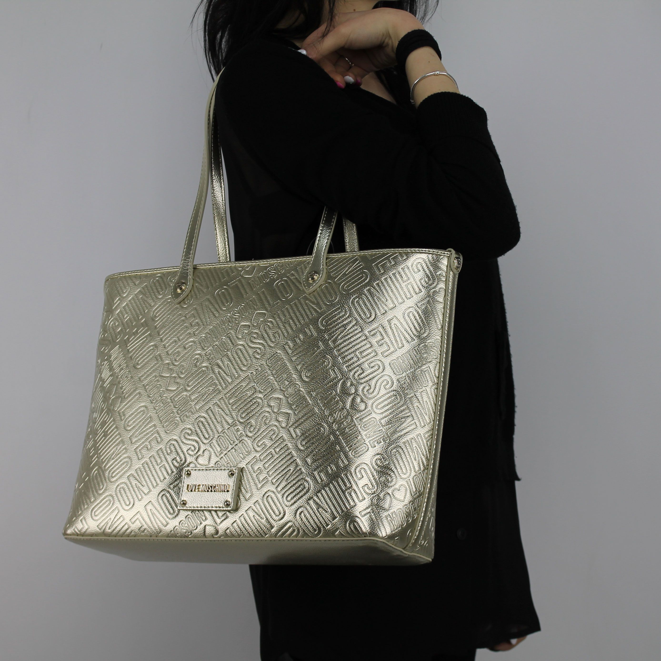 Shopping Love Moschino in similpelle dorata effetto bottalato, con stampa logata in rilievo su tutta la superficie. La shopping, dotata di una chiusura zip, presenta la suo interno una fodera di rivestimento in tessuto logato color rame e due pratiche tasche porta piccoli oggetti, di cui una chiusa con zip. Lettering metallico Love Moschino dorato applicato su una targhetta in similpelle, nel lato frantale. Sacca proteggi polvere originale inclusa.