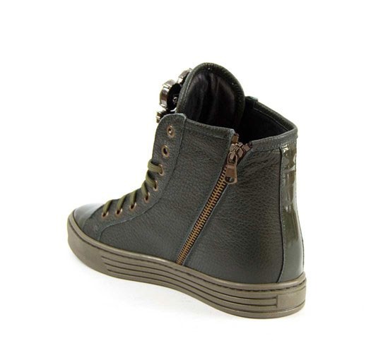 sneaker in pelle con dettaglio spilla strass, zip interno piede, fodera pelle, plantare di 3,5 cm, fondo gomma, made in italy