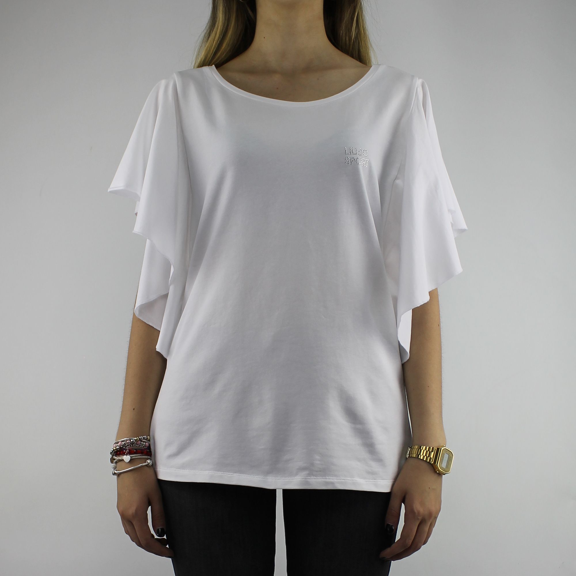 T-Shirt Liu Jo Sport bianca in jersey. Questa fantastica t-shirt adatta per tutte le occasioni presenta maniche volants con applicazione di microperle e strass.