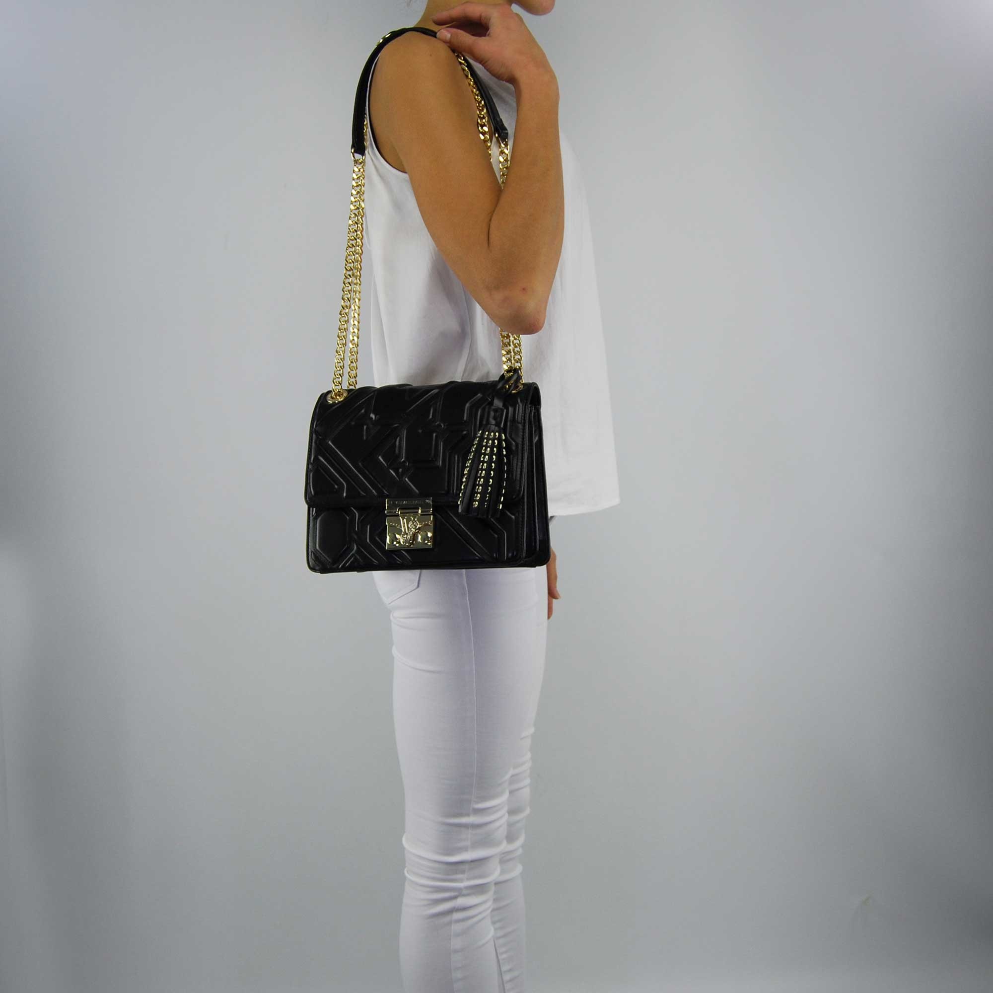 Borsa tracolla Versace Jeans in ecopelle nera, chiusura con patta e gancio decorativo con logo del brand. All'interno presenta tre scomparti, quello centrale chiuso con zip dorata. Piccola tasca portaoggetti all'interno. Fodera interna nera, sacca proteggi polvere originale inclusa.