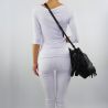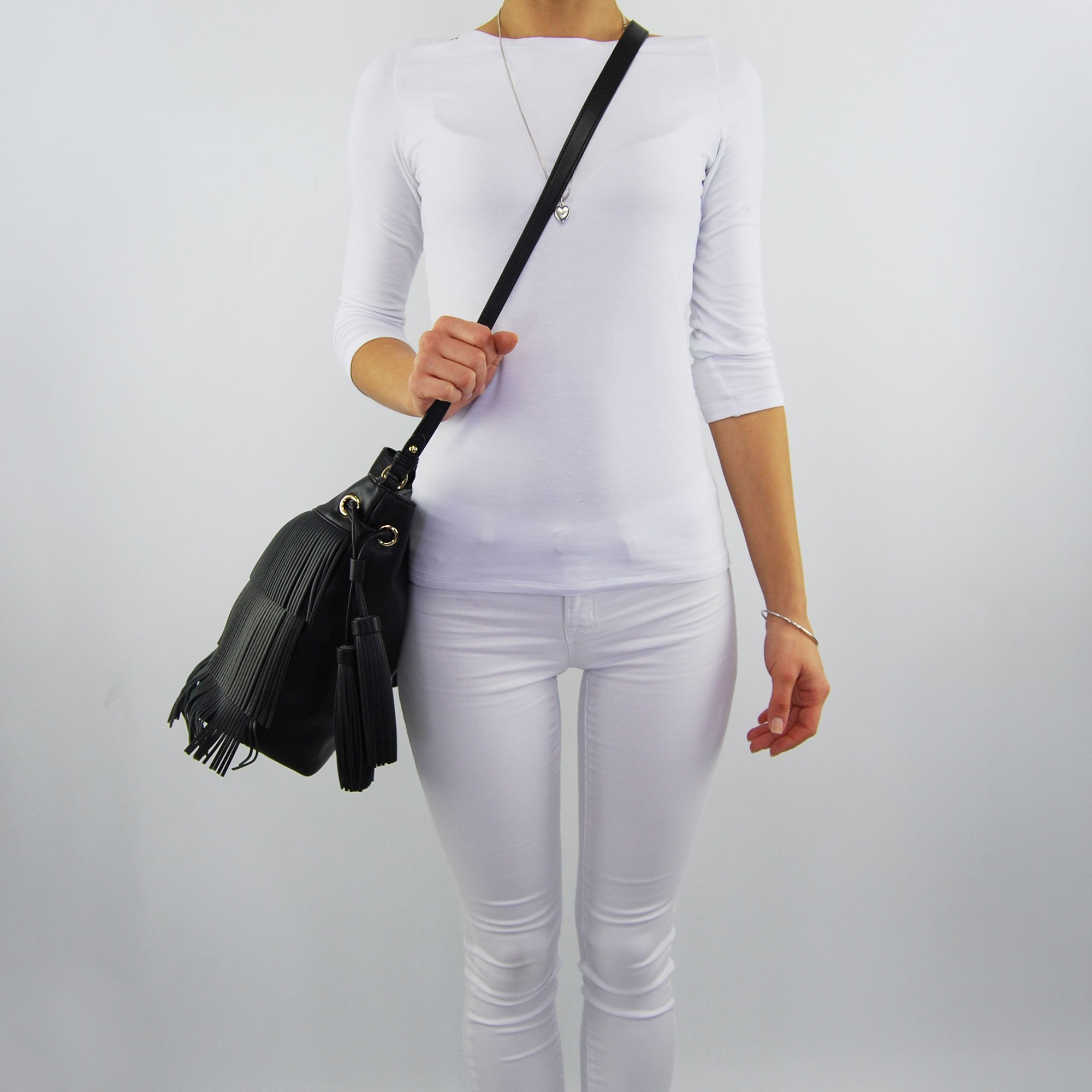 Borsa tracolla Patrizia Pepe grande in ecopelle nera, impreziosita nel lato frontale da frange nere e due pendagli frangiati ai lati. Logo patrizia pepe color oro applicato. Chiusura con laccetti da stringere e bottone magnetico. All'interno taschine portaoggetti. Sacca proteggi polvere originale inclusa.