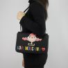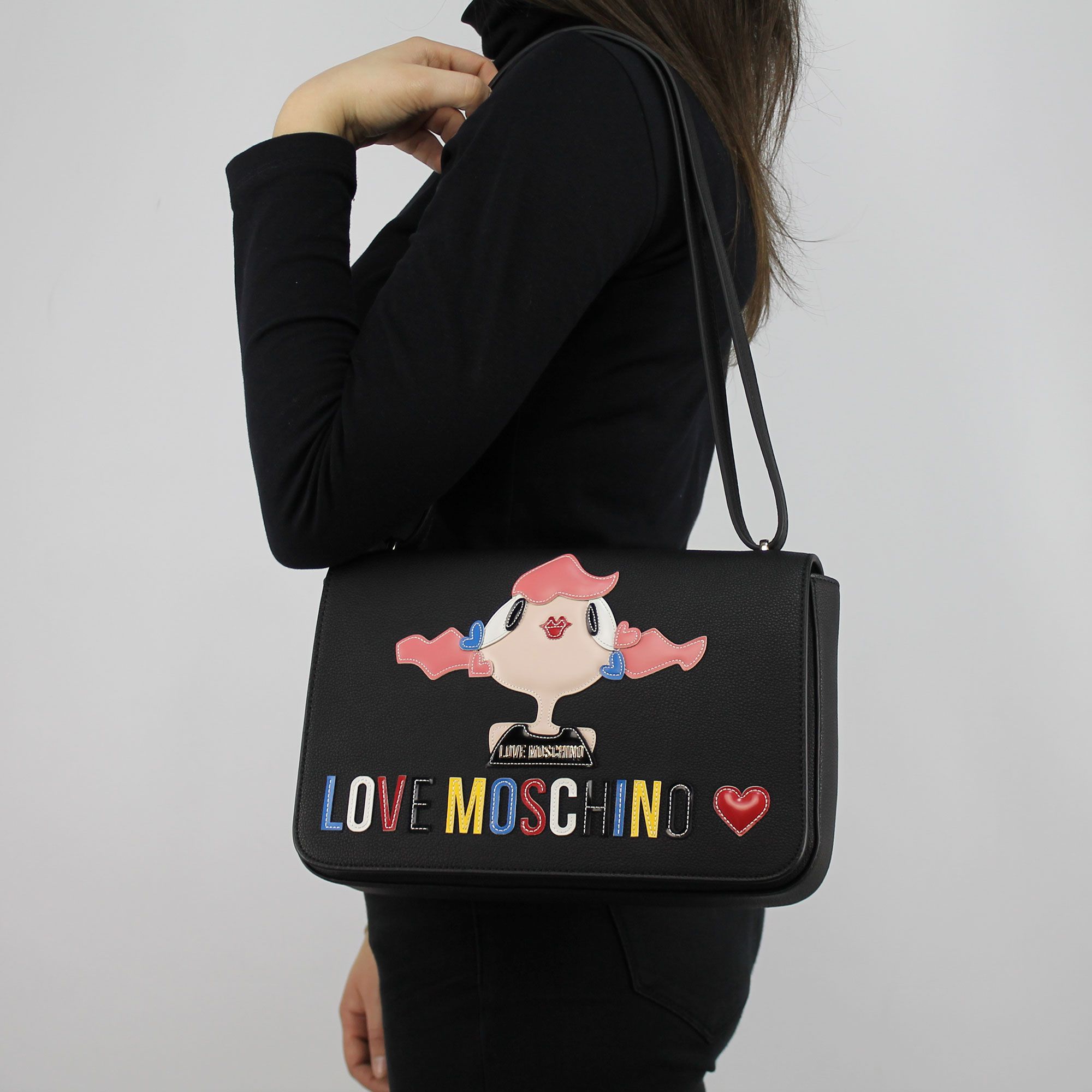 Borsa tracolla Love Moschino in similpelle nera bottalata. Chiusura con patta e bottoni magnetici; applicazioni dorate.