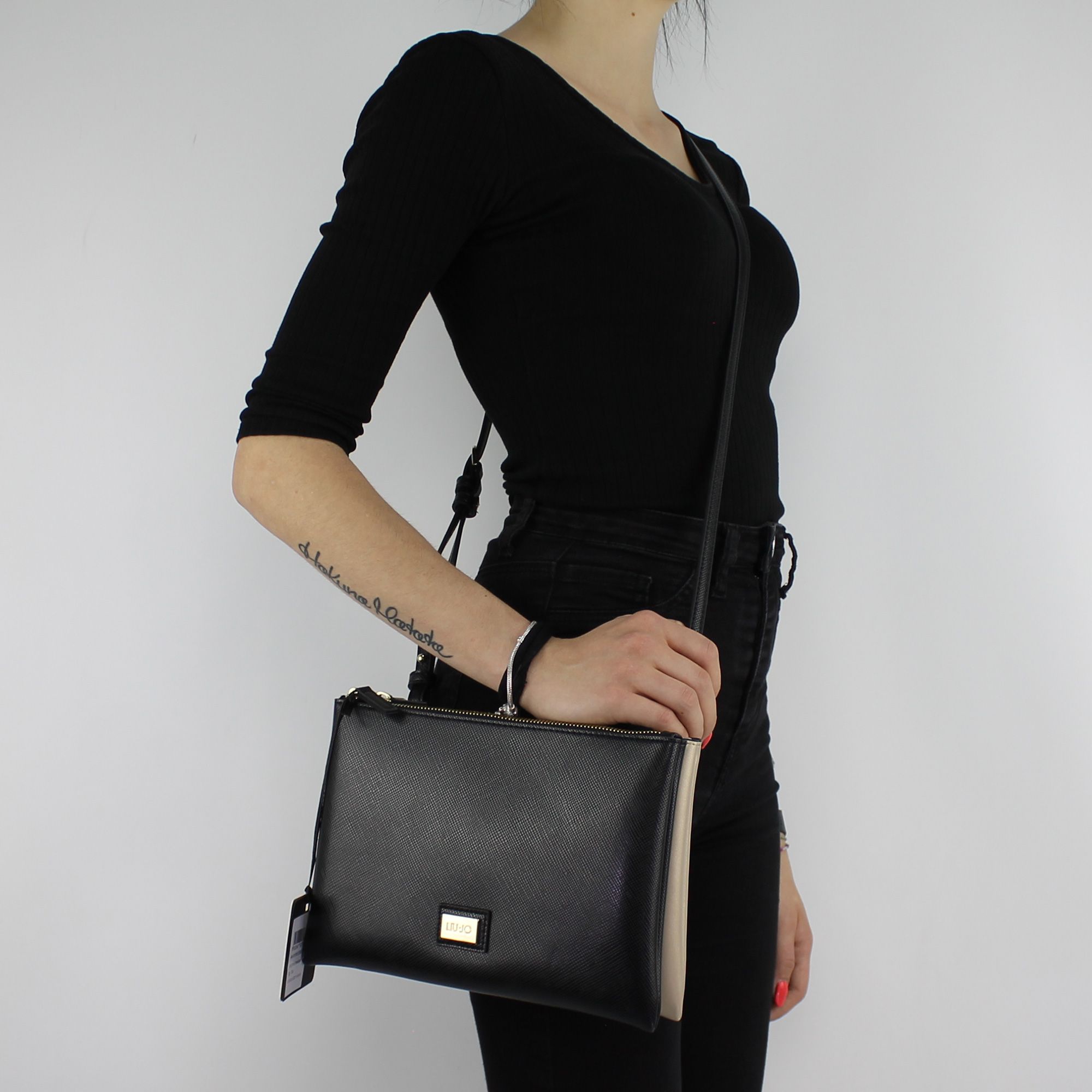 Borsa tracolla Liu Jo hawaii in similpelle colore nero e color soia. La tracolla è composta da due bustine che creano due scomparti separati entrambi chiusi da zip dorata. Uno scomparto esternamente è di colore nero e l'altro di colore oro laminato. La tracolla è dotata di tracolla in tinta, regolabile in lunghezza e asportabile; La borsa senza tracolla può essere utilizzata anche come pochette da mano. Gli interni sono a contrasto rispetto i colori esterni. Entrambi gli scomparti sono molto comodi e spaziosi.Targhetta con logo del brand applicata frontalmente, inserti color oro. Sacca proteggi polvere originale inclusa.