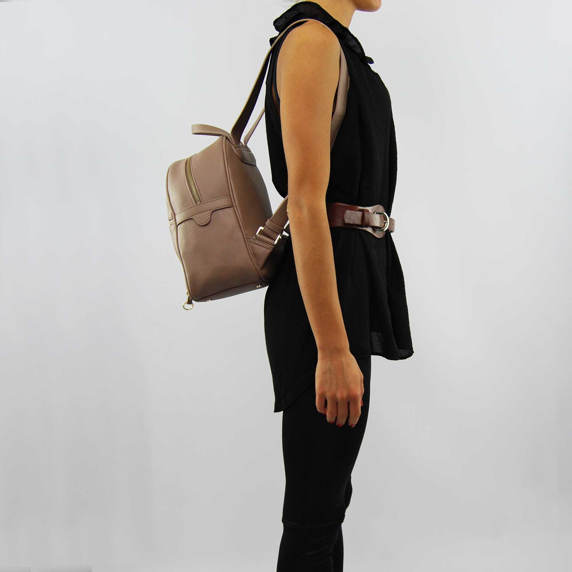 Borsa Zaino LiuJo eze in ecopelle color caribou con tasca frontale. Chiusura con zip color oro, logo Liujo ed applicazioni dorate. Spalline regolabili. Sacca proteggi polvere originale inclusa.