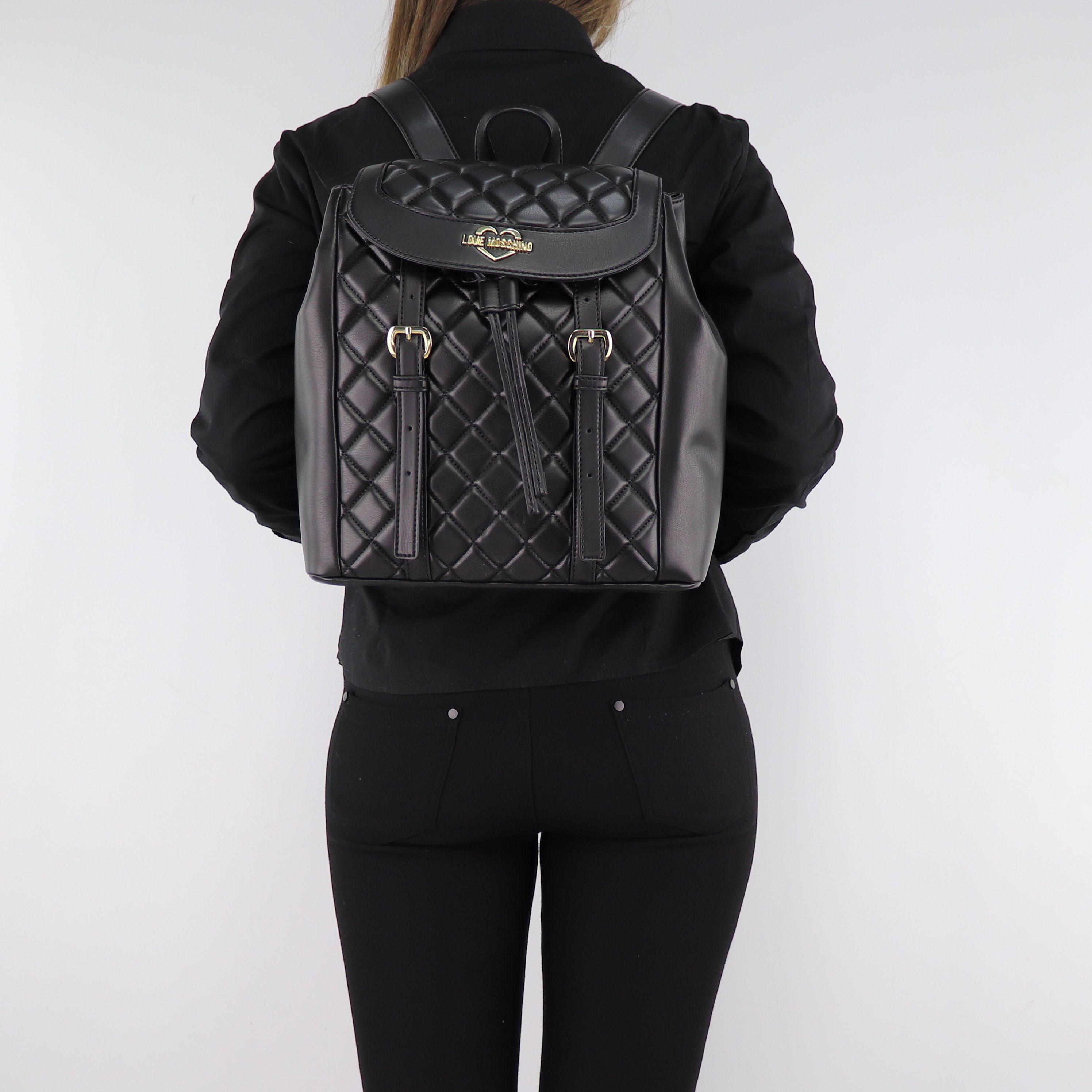 Questo zaino Love Moschino® è realizzato in pelle sintetica e si caratterizza per il suo effetto trapuntato e le fibbie dall'animo rock poste sul davanti. Al suo interno ha un unico scomparto foderato con tessuto rosso lucido molto elegante e completamente ricoperto dalla stampa del logo della nota casa di moda Moschino. La chiusura è con bottone magnetico che ne assicura una perfetta chiusura. Questo zaino Moschino molto capiente è stato presentato come accessorio di tendenza per questa collezione autunno inverno 2018-2019. L'eleganza e lo stile di questa borsa vi farà distinguere ovunque, ideale per i tuoi outfit più prestigiosi. Viene spedito con la sacca proteggipolvere originale inclusa. In queste foto potete ammirarlo nel colore nero con il logo e le altre applicazioni metalliche dorate.